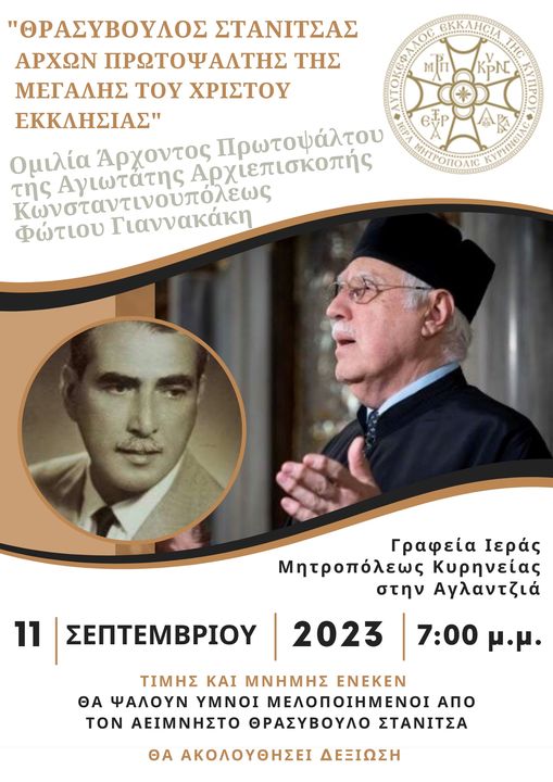 Ομιλία του Άρχοντος Πρωτοψάλτου της Αγιωτάτης Αρχιεπισκοπής Κωνσταντινουπόλεως Φώτιου Γιαννακάκη με θέμα: “Θρασύβουλος Στανίτσας Άρχων Πρωτοψάλτης της Μεγάλης του Χριστού Εκκλησίας” θα πραγματοποιηθεί την Δευτέρα 11 Σεπτεμβρίου 2023 στα γραφεία της Ιεράς Μητροπόλεως Κυρηνείας στην Αγλαντζιά στη Λευκωσία.