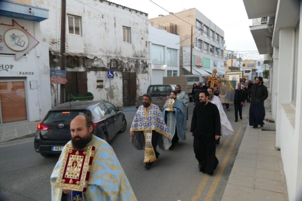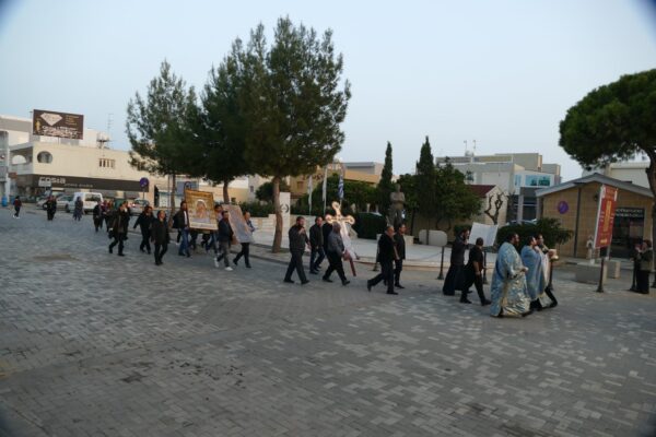 Πριν την λήξη της προθεσμίας του διατάγματος του προέδρου της Κυπριακής Δημοκρατίας η ώρα 6:00μ.μ. της απαγόρευσης των μετακινήσεων, έγινε η περιφορά στους κεντρικούς δρόμους αυθόρμητα από τους Ιερείς του Μητροπολιτικού Ναού. Λιτανεύτηκαν ο Τίμιος Σταυρός, το Ιερό Λείψανο του Αγίου Νεοφύτου, η Εικόνα του Ευαγγελισμού, τριών εικόνων της Παναγίας και η Εικόνα του Αγίου Γεωργίου του Τροπάιοφόρου.