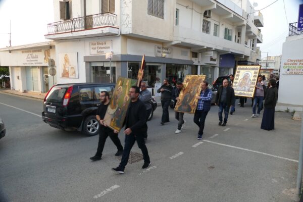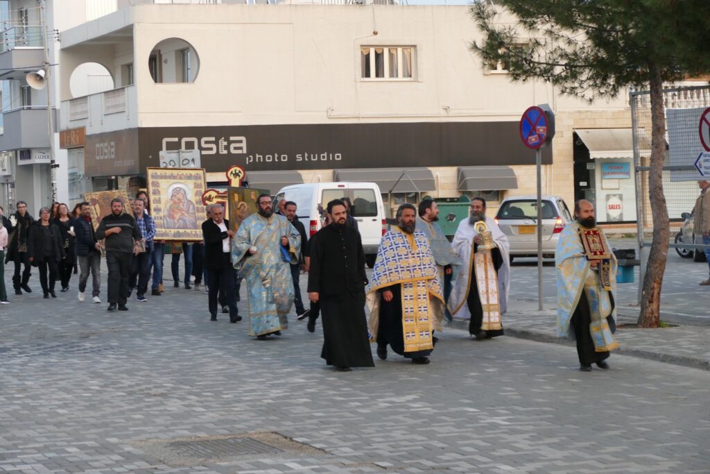 Πριν την λήξη της προθεσμίας του διατάγματος του προέδρου της Κυπριακής Δημοκρατίας η ώρα 6:00μ.μ. της απαγόρευσης των μετακινήσεων, έγινε η περιφορά στους κεντρικούς δρόμους αυθόρμητα από τους Ιερείς του Μητροπολιτικού Ναού. Λιτανεύτηκαν ο Τίμιος Σταυρός, το Ιερό Λείψανο του Αγίου Νεοφύτου, η Εικόνα του Ευαγγελισμού, τριών εικόνων της Παναγίας και η Εικόνα του Αγίου Γεωργίου του Τροπάιοφόρου.