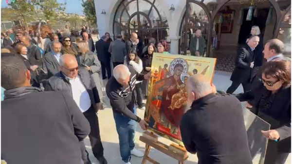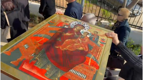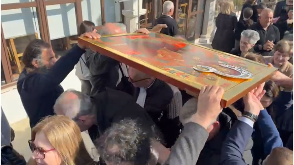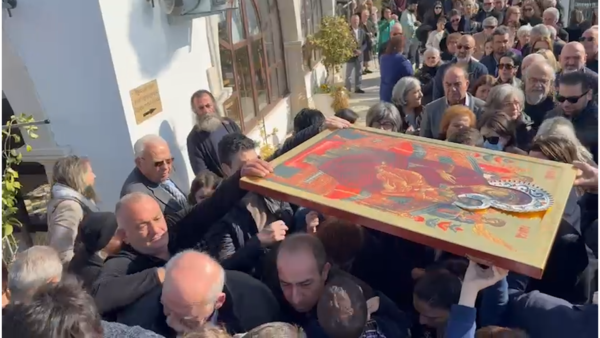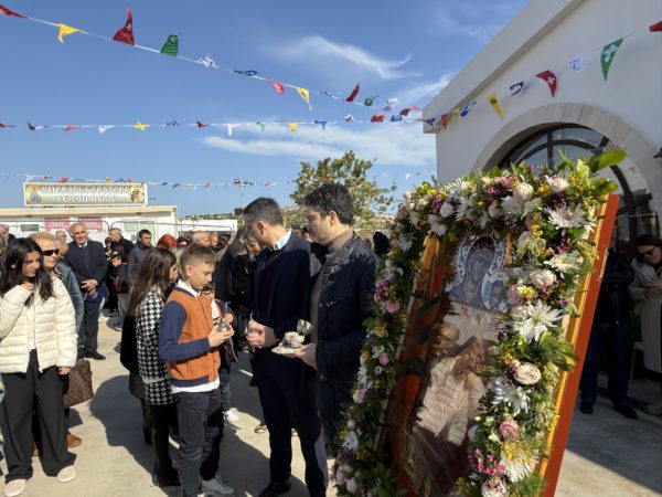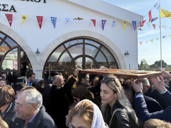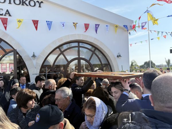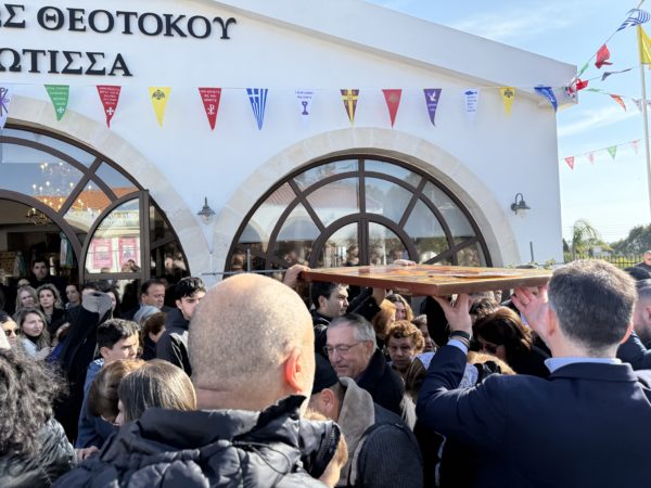 Αμέσως μετά τελέσθηκε Ιερή Λιτανεία στον προαύλιο χώρο του Ιερού Ναού όπου εκατοντάδες πιστοί συνόδευσαν την Εικόνα και πέρασαν κάτω από αυτήν για ευλογία.