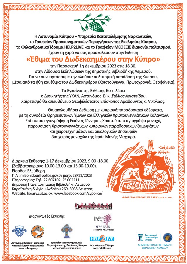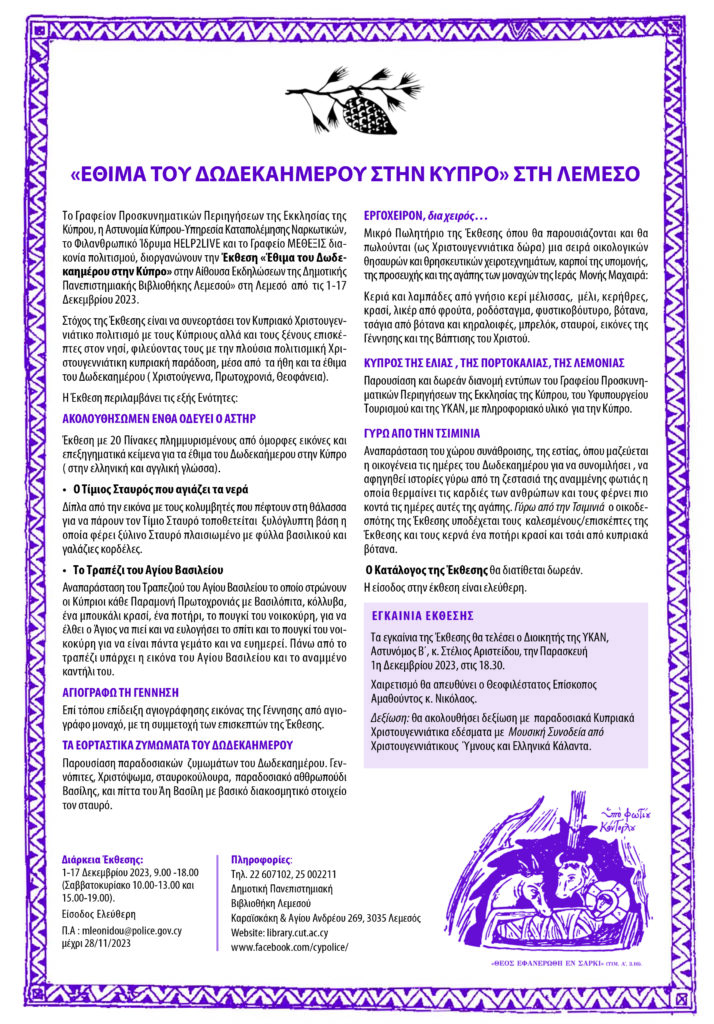 Ο Θεοφιλέστατος Επίσκοπος Αμαθούντος κ. Νικόλαος θα απευθύνει χαιρετισμό στην Έκθεση «Έθιμα του Δωδεκαημέρου στην Κύπρο» η οποία εγκαινιάζται την Παρασκευή, 1η Δεκεμβρίου 2023 στις 18.30, στην Αίθουσα Εκδηλώσεων της Δημοτικής Πανεπιστημιακής Βιβλιοθήκης Λεμεσού.