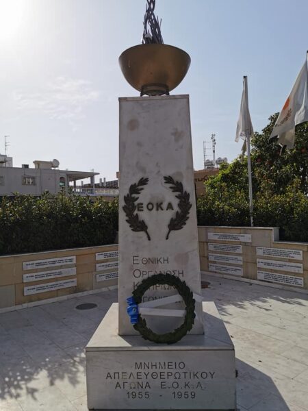 Μετά το πέρας της Δοξολογίας τελέστηκε τρισάγιο και κατάθεση στεφάνου στο Μνημείο Ηρώων ΕΟΚΑ 1955-59 που βρίσκεται δίπλα από τον Ναό.