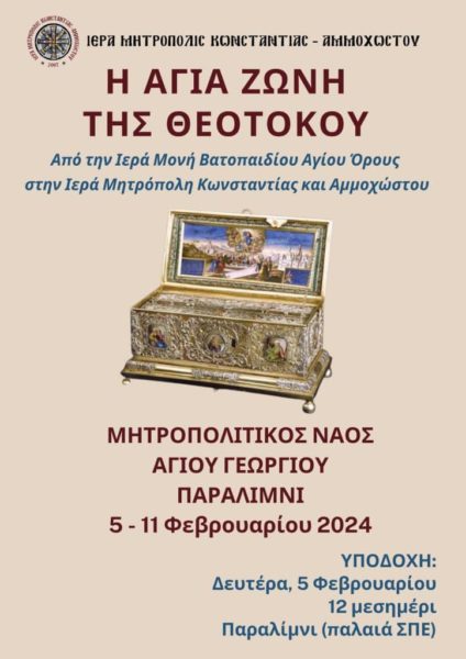 Στην επαρχία Αμμοχώστου θα αφιχθεί σε λίγες ημέρες η Αγία Ζώνη της Υπεραγίας Θεοτόκου εκ της Ιεράς Μεγίστης Μονής Βατοπαιδίου. Το μοναδικό θεομητορικό κειμήλιο από την επίγεια ζωή της Παναγίας μας θα γίνει δεκτό με τιμές αρχηγού κράτους στο αεροδρόμιο της Λάρνακας, την Δευτέρα 5 Φεβρουαρίου 2024, και εν συνεχεία, στις 12 το μεσημέρι της ίδιας ημέρα θα γίνει η επίσημη υποδοχή στο Παραλίμνι, προσωρινή έδρα της Ιεράς Μητροπόλεως Κωνσταντίας και Αμμοχώστου.