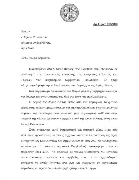 Ο Πανιερώτατος Μητροπολίτης Κωνσταντίας και Αμμοχώστου κ. Βασίλειος, ευρισκόμενος τις μέρες αυτές στο Μποσζέ (Bossey) της Ελβετίας, συμμετέχοντας σε συνάντηση της συντακτικής επιτροπής της επιτροπής «Πίστεως και Τάξεως» του Παγκοσμίου Συμβουλίου Εκκλησιών, έχοντας πληροφορηθεί από τα μέσα ενημέρωσης την εκλογή ως νέου Δημάρχου Αγίας Νάπας του μέχρι πρότινος Δημαρχεύοντος κ. Χρίστου Ζαννέττου, απέστειλε συγχαρητήρια επιστολή προς τον νεοεκλεγέντα Δήμαρχο, εκφράζοντας τα συγχαρητήρια του και τις ευχές για δύναμη και ενίσχυση έργο που αναλαμβάνει.