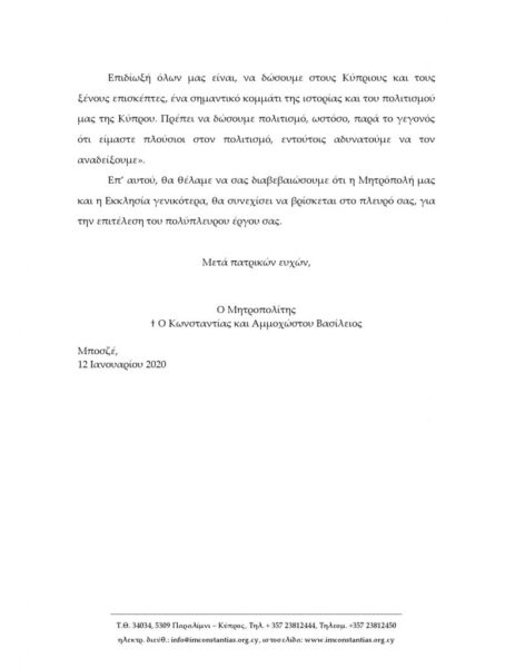 Επιδίωξή όλων τόνισε ο Πανιερώτατος είναι, να δώσουμε στους Κύπριους και τους ξένους επισκέπτες, ένα σημαντικό κομμάτι της ιστορίας και του πολιτισμού μας της Κύπρου. Πρέπει να δώσουμε πολιτισμό, ωστόσο, παρά το γεγονός ότι είμαστε πλούσιοι στον πολιτισμό, εντούτοις αδυνατούμε να τον αναδείξουμε».