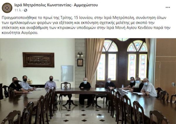 Πραγματοποιήθηκε το πρωί της Τρίτης, 15 Ιουνίου, στην Ιερά Μητρόπολη Κωνσταντίας και Αμμοχώστου, συνάντηση όλων των εμπλεκομένων φορέων για εξέταση και εκπόνηση σχετικής μελέτης με σκοπό την επέκταση και αναβάθμιση των κτιριακών υποδομών στην Ιερά Μονή Αγίου Κενδέου παρά την κοινότητα Αυγόρου, από όπου το ως άνω φωτογραφικό στιγμιότυπο.