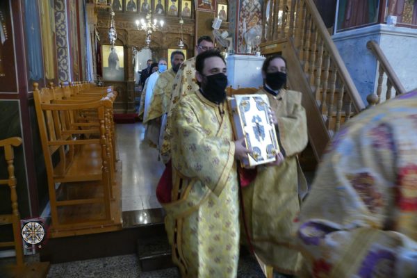 Ο ολιγάριθμος αριθμός πιστών που εκκλησιάστηκε, παρακολούθησε τη θεία Λειτουργία από το προαύλιο του ναού, τηρώντας τις σχετικές αποστάσεις.
