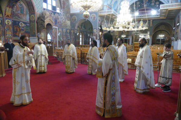 Της ιεράς ακολουθίας η οποία τελέστηκε (κεκλεισμένων των Θυρών) προέστη ο Πρωτοσύγγελος της Ιεράς Μητροπόλεως Κωνσταντίας και Αμμοχώστου, πανοσιολογιότατος Αρχιμανδρίτης Αυγουστίνος Κκαρας πλαισιούμενος από τους Ιερείς και Διακόνους του Ναού.