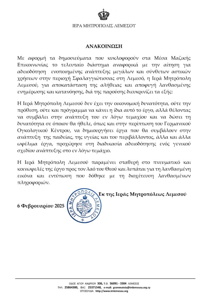 Η Ιερά Μητρόπολη Λεμεσού δεν έχει την οικονομική δυνατότητα, ούτε προτίθεται να προχωρήσει από μόνη της σε ενοποιημένες αναπτύξεις μεγάλων και σύνθετων αστικών χρήσεων, στην περιοχή Σφαλαγγιώτισσας, όπως διευκρινίζει σε σημερινή ανακοίνωση της.