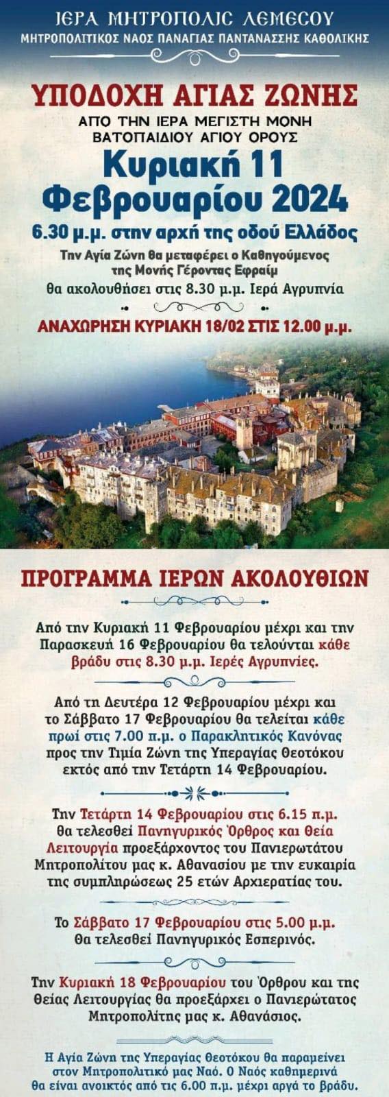 Ο Μητροπολιτικός Ναός Παναγίας Παντανάσσης Καθολικής Λεμεσού θα υποδεχθεί την Τιμία Ζώνη της Υπεραγίας Θεοτόκου από την Ιερά Μεγίστη Μονή Βατοπαιδίου του Αγίου Όρους στις 11 Φεβρουαρίου 2024, στις 18:30 στην αρχή της οδού Ελλάδος.