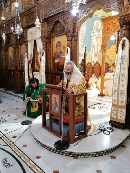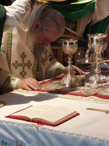 Αμέσως μετά τη Θεία Λειτουργία, τελέστηκε ο Εσπερινός της Γονυκλισίας, χοροστατούντος του Πανιερωτάτου, ο οποίος διάβασε την πρώτη στάση των Ευχών προς την Παναγία Τριάδα.