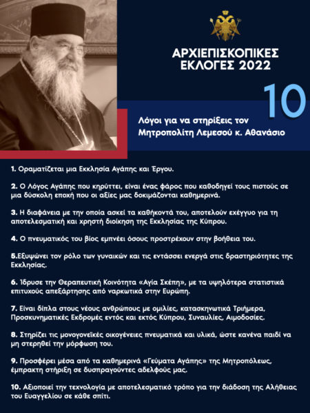 “Ο λόγος και το έργο του Μητροπολίτη Λεμεσού Αθανάσιου είναι φωτεινός φάρος για όλους εμάς τους πιστούς. Όσοι παρακολουθούμε την πορεία του εδώ και δεκαετίες, νιώθουμε ασφάλεια κοντά του”, αναφέρει σε ανάρτησή της η ομάδα στήριξης του Μητροπολίτη Λεμεσού για τις Αρχιεπισκοπικές εκλογές και παραθέτει δέκα λόγους για τους οποίους στηρίζει: