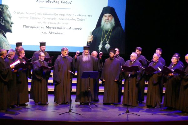 Στο κατάμεστο Παττίχειο Δημοτικό Θέατρο Λεμεσού, ο Δήμος Λεμεσού απένειμε, την Τετάρτη 13 Δεκεμβρίου, εκ μέρους ολόκληρης της πόλης, το Βραβείο Προσφοράς «Χριστόδουλος Σώζος» 2023, στον Μητροπολίτη Λεμεσού κ. Αθανάσιο, για το τεράστιο έργο και την πολυεπίπεδη προσφορά του προς την πόλη, η οποία τον καθιστά ως μια από τις πιο σημαντικές προσωπικότητες της σύγχρονης Λεμεσού.