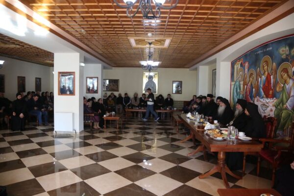 Μετά το τέλος της Λειτουργίας, ο Γέροντας Ζαχαρίας μίλησε στους πατέρες και στους προσκυνητές στο αρχονταρίκι της Μονής.
