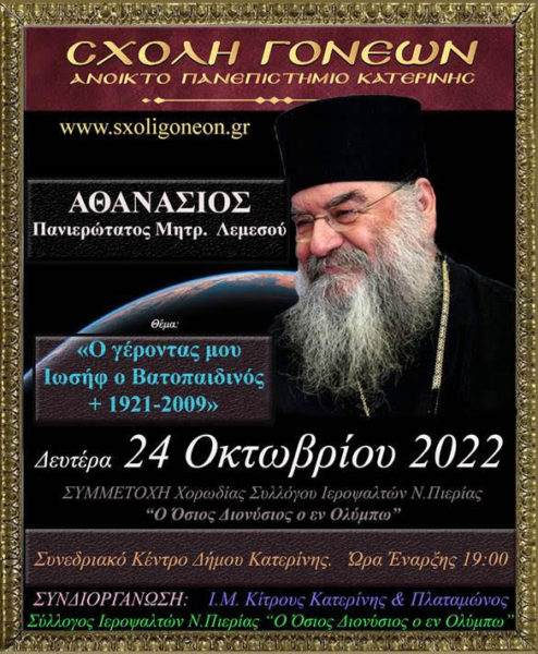 Πανηγυρική θα είναι η έναρξη της 34ης Ακαδημαϊκής χρονιάς για το 2022-2023 της Σχολής Γονέων – Ανοικτό Πανεπιστήμιο Κατερίνης την Δευτέρα 24ης Οκτωβρίου 2022 με επίσημο ομιλητή και καλεσμένο τον Πανιερώτατο Μητροπολίτη Λεμεσού π. Αθανάσιο. Tο Θέμα της ομιλίας του θα είναι: «Ο γέροντας μου Ιωσήφ ο Βατοπαιδινός «1921-2009».