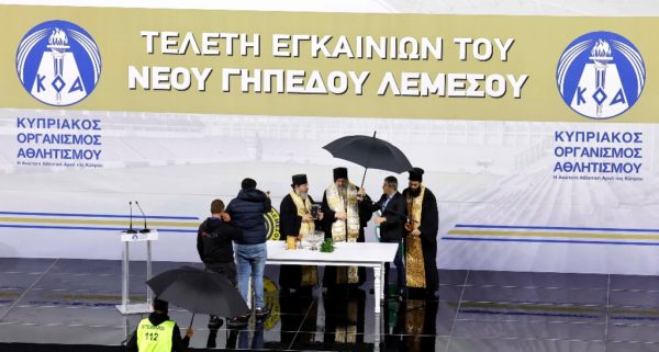 Υπό δυνατή βροχή εγκαινιάστηκε χθες, Παρασκευή 25 Νοεμβρίου 2022, το νέο ποδοσφαιρικό γήπεδο της Λεμεσού “Αλφαμέγα Στάδιο”, παρουσία του Προέδρου της Δημοκρατίας Νίκου Αναστασιάδη, του προέδρου του ΚΟΑ και πολλών εκπροσώπων του πολιτικού και αθλητικού χώρου.