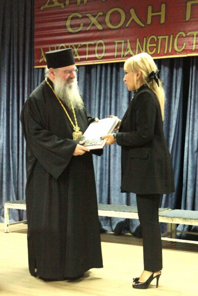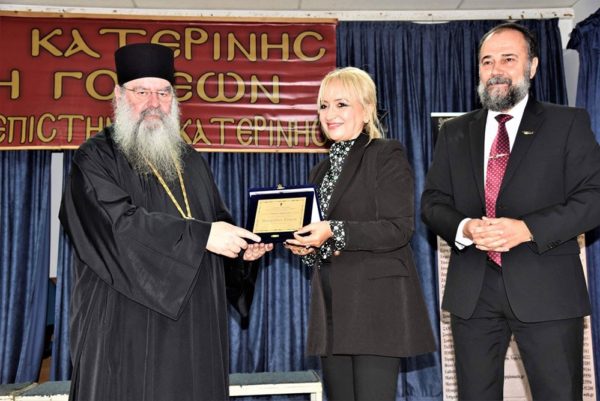 Τέλος, εκ μέρους της Σχολής ο Σεβασμιότατος κ. Γεώργιος επέδωσε αναμνηστική πλακέτα. Η Σχολή τίμησε την αντιπεριφεριάρχη Πιερίας κ. Σοφία Μαυρίδου η οποία έλαβε την τιμητική πλακέτα δια χειρός του προσκεκλημένου Σεβασμιωτάτου κ. Αθανασίου.