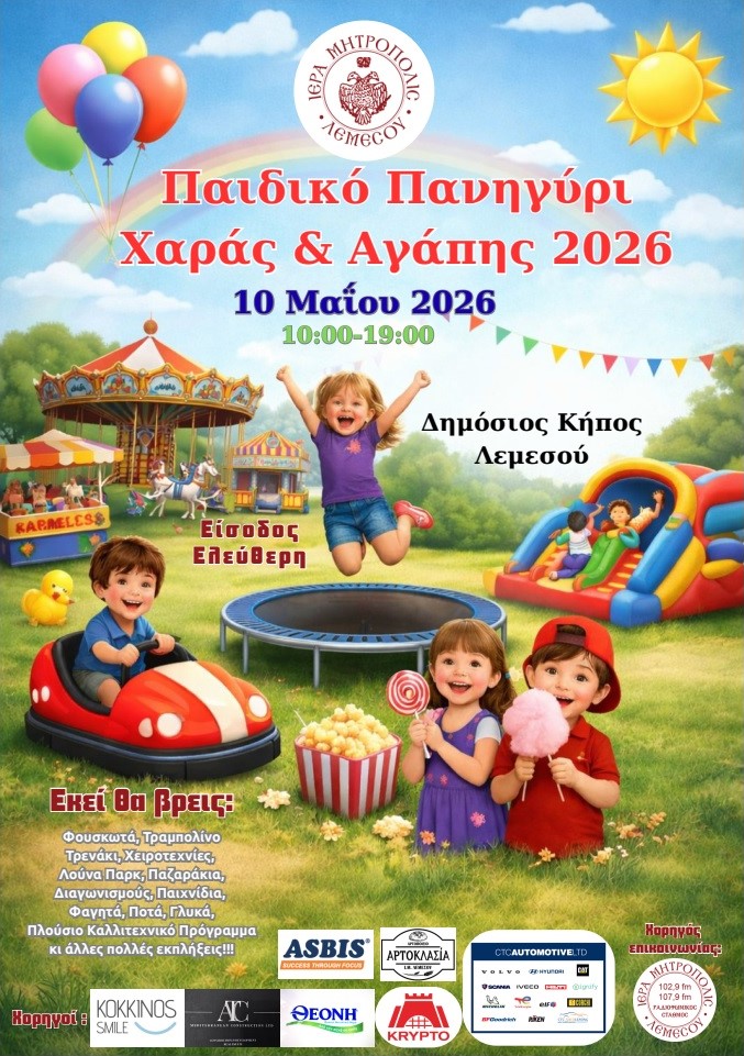 Το Παιδικό Πανηγύρι Χαράς και Αγάπης 2026, διοργανωμένο από την Ιερά Μητρόπολη Λεμεσού, είναι προγραμματισμένο για την Κυριακή 10 Μαΐου 2026 (10:00π.μ. – 7:00μ.μ.) στον Δημόσιο Κήπο Λεμεσού.
