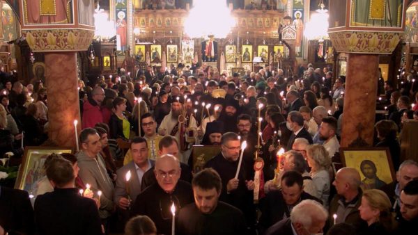 Κατά τη διάρκεια του Εσπερινού, το αναστάσιμο μήνυμα του Ευαγγελίου ακούστηκε κατά την παράδοση σε πολλές ξένες γλώσσες. Στη συνέχεια, ακολούθησε λιτανεία πέριξ του ιερού ναού. Μετά την απόλυση του Εσπερινού ο Πανιερώτατος μοίρασε το πασχαλινό αυγό και αντάλλαξε πασχαλινές ευχές με τους πιστούς.