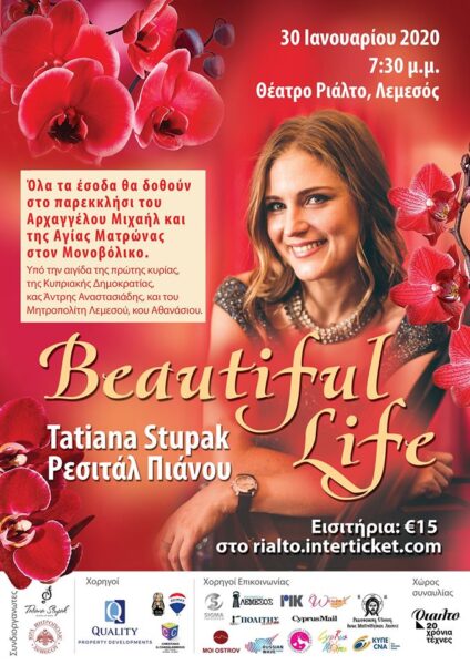 ΚΥΠΡΟΣ – ΙΕΡΑ ΜΗΤΡΟΠΟΛΗ ΛΕΜΕΣΟΥ – Ο Ιερός Ναός Αρχαγγέλου Μιχαήλ Μονοβόλικου πραγματοποιεί στο Θέατρο Ριάλτο, κατά την Πέμπτη 30 Ιανουαρίου 2020 στις 7:00 μμ, ρεσιτάλ πιάνου με την διεθνούς φήμης πιανίστρια Τατιάνα Στούπακ. Εισιτήρια προπωλούνται από τα ταμεία του θεάτρου.