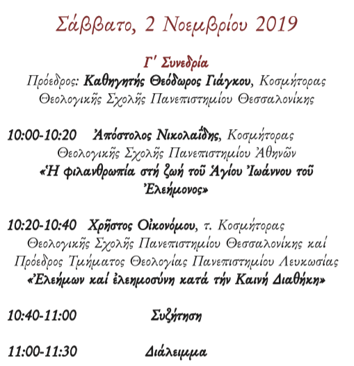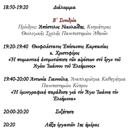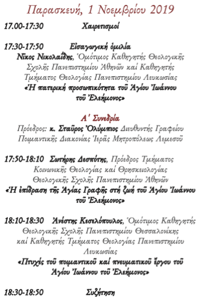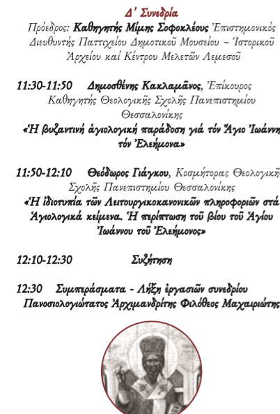 Η Ιερά Μητρόπολη Λεμεσού σε συνεργασία με το Τμήμα Θεολογίας του Πανεπιστημίου Λευκωσίας, μέσα στα πλαίσια των εκδηλώσεων για τον Πολιούχο Άγιο της Μητροπόλεώς, Ιωάννη τον Ελεήμονα και τα 1400 χρόνια από την κοίμηση του, διοργανώνει Επιστημονικό Συνέδριο με Θέμα “Άγιος Ιωάννης ο Ελεήμων. Ιστορία, Θεολογία, Πνευματική Ζωή”.