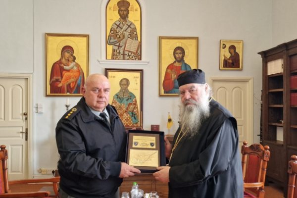 Ο Πανιερώτατος έδωσε ευλογία μια εικόνα του πολιούχου Αγίου της πόλεως, Αγίου Ιωάννη του Ελεήμονα, ενώ ο κ. Αγγελίδης επέδωσε στον Πανιερώτατο τιμητική πλακέτα με το έμβλημα της Ταξιαρχίας.