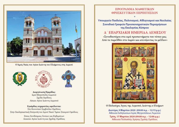 «Συνοδοιπόροι στα ιερά προσκυνήματα του τόπου μας. Από το παρελθόν στο παρόν και ατενίζοντας το μέλλον» είναι ο τίτλος της Δ’ Επαρχιακής Ημερίδας Λεμεσού στο πλαίσιο του Προγράμματος Μαθητικών Θρησκευτικών Περιηγήσεων.