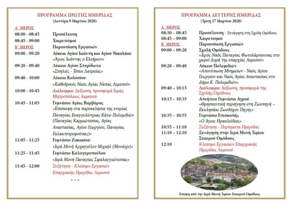 Η Ημερίδα θα πραγματοποιηθεί τη Δευτέρα, 9 Μαρτίου 2020 (09:00 π.μ. – 12:15 μ.μ.) στην Αίθουσα Εκδηλώσεων Ιεράς Μητροπόλεως Λεμεσού και την Τρίτη, 17 Μαρτίου 2020 (09:00 π.μ. – 12:00 μ.μ.) στην Αίθουσα Πολλαπλής Χρήσης Σχολής Ομόδους.