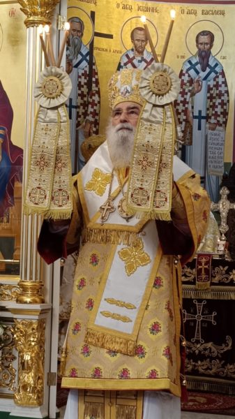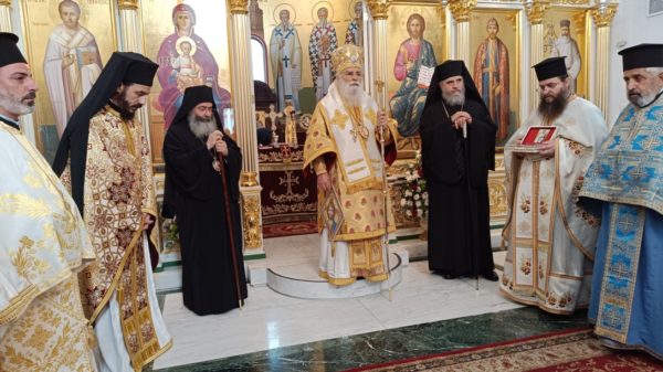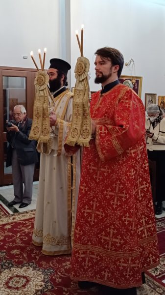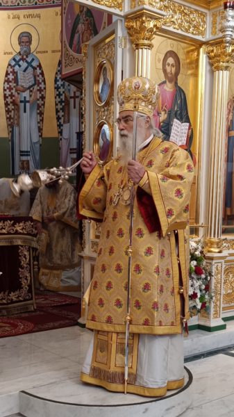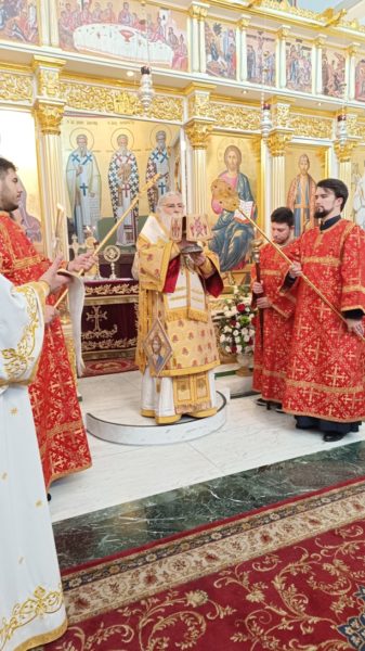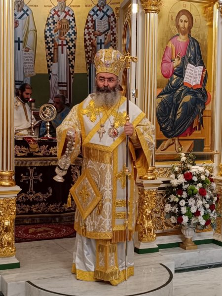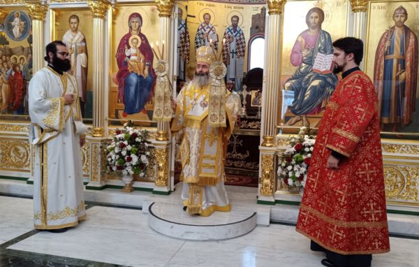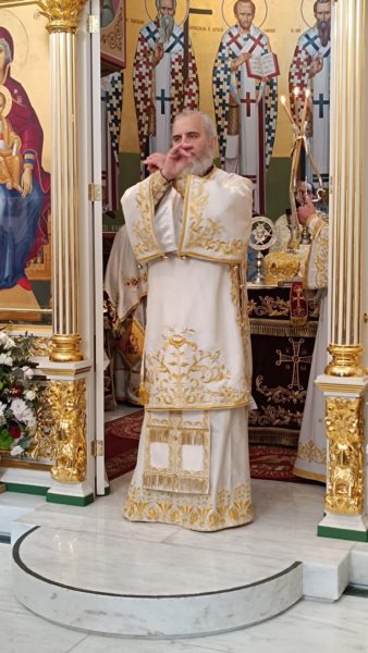 Της Θείας Λειτουργίας, στον ιερό ναό Αναλήψεως του Κυρίου και Αγίου Φιλουμένου, προεξήρχε ο Σεβασμιώτατος Μητροπολίτης Βόστρων κ. Τιμόθεος και συλλειτούργησαν οι Θεοφιλέστατοι Επίσκοποι Αμαθούντος κ. Νικόλαος και Νεαπόλεως κ. Πορφύριος.