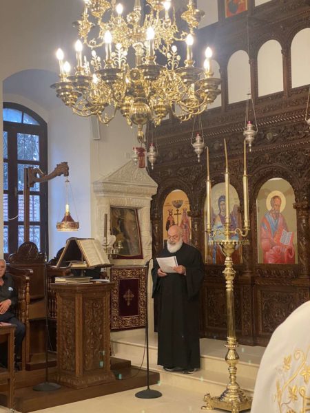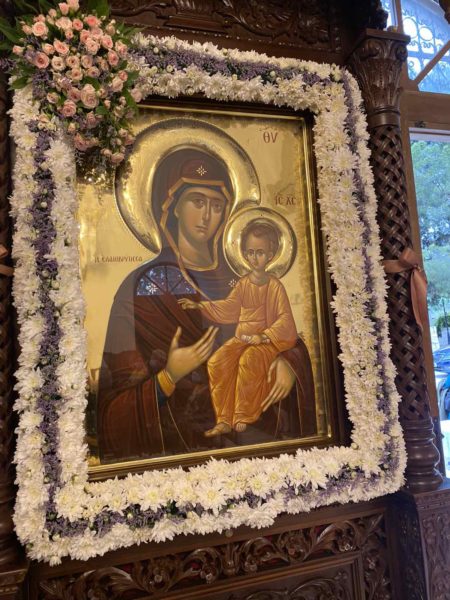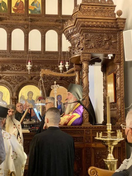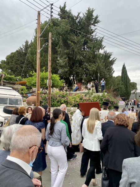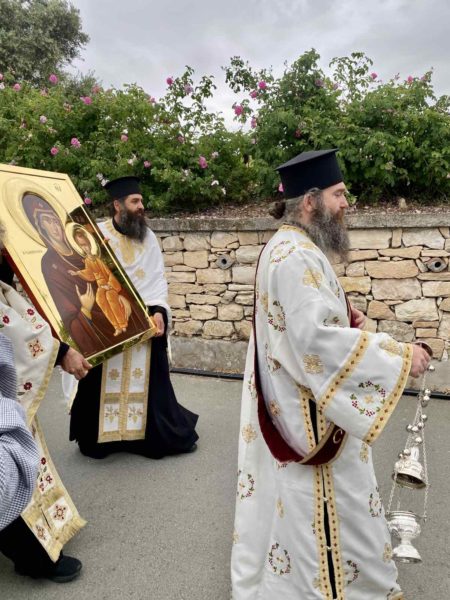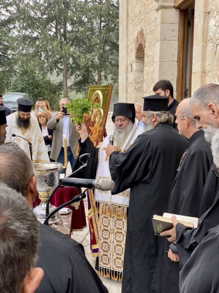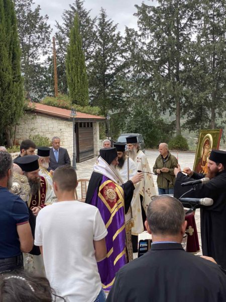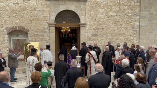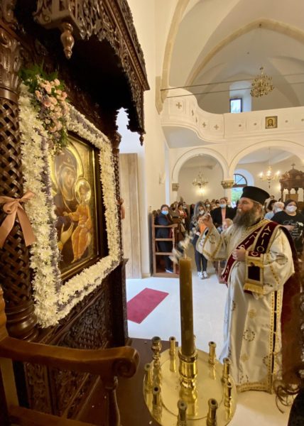 Πριν από τον Αγιασμό, ο Πανιερώτατος μαζί με τον κλήρο και τον λαό υποδέχθηκαν αντίγραφο της ιεράς Εικόνος της Παναγίας της Ελαιοβρύτισσας. Μετά ακολούθησε ο Αγιασμός και η Τελετή των Θυρανοιξίων και ακολούθος ο πρώτος Εσπερινός μέσα στον ανακαινισμένο ιερό ναό.