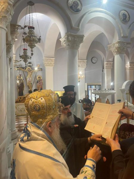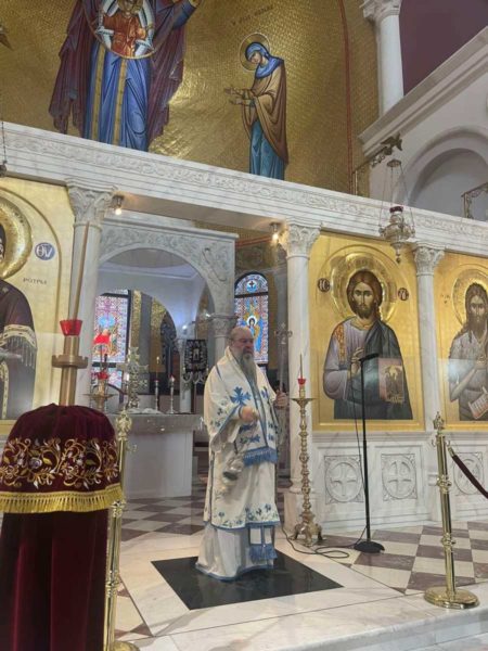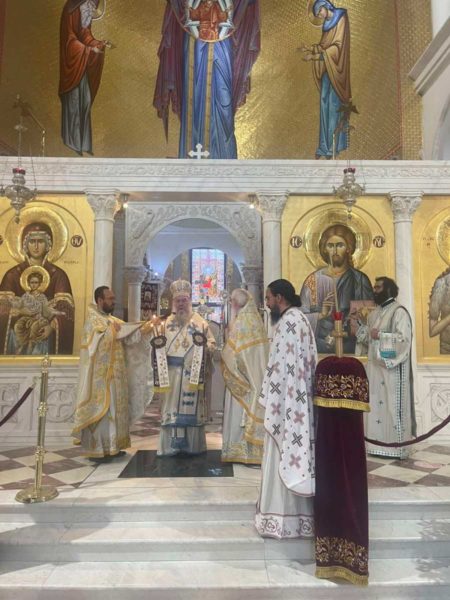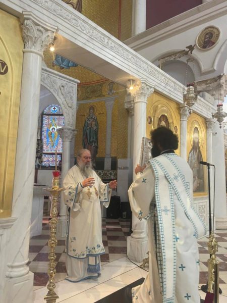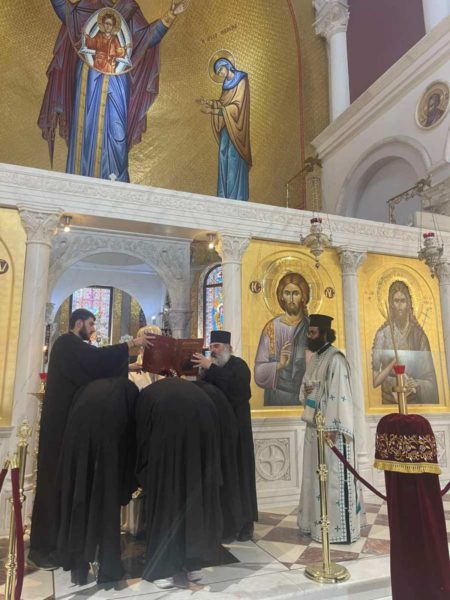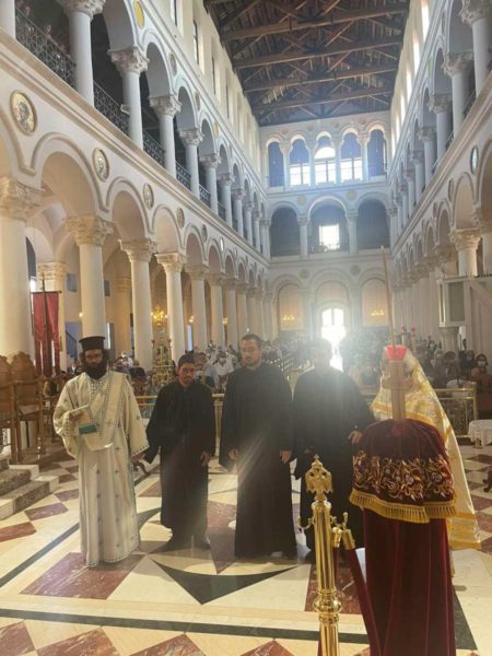 Πρό του τέλους της Θείας Λειτουργίας, ο Πανιερώτατος τέλεσε τις χειροθεσίες εις εκκλησιαστική Διακονία σε τρεις νέους που διακονούν στον ναό.