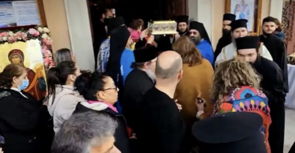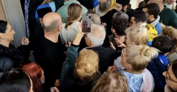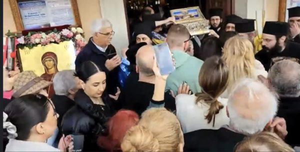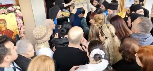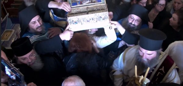 Οι πιστοί με την βοήθεια της αστυνομίας και την πατέρων πέρασαν κάτω από την Αγία Ζώνη για να προλάβουν να πάρουν ευλογία πριν αναχωρήσει το Ιερό Κειμήλιο.