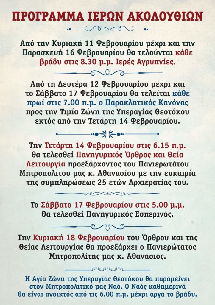 Η Τιμία Ζώνη θα παραμείνει στον Ιερό Μητροπολιτικό Ναό Παναγίας Παντανάσσης Καθολικής Λεμεσού σε προσκύνημα μέχρι και την Κυριακή 18 Φεβρουαρίου 2024, στις 12 το μεσημέρι.