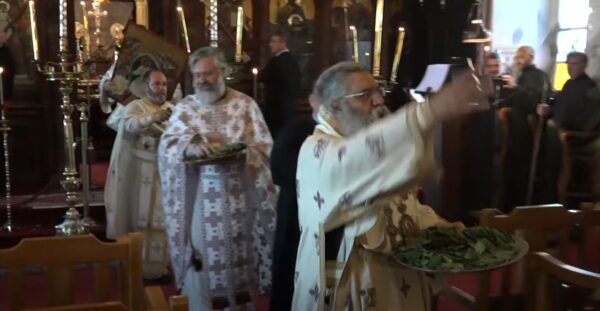 Ο Μητροπολίτης Μόρφου κ. Νεόφυτος βγαίνει με τα βάγια στα χέρια για το “Ανάστα ο Θεός”, κατά το Μεγάλο Σάββατο πρωϊας, 18 Απριλίου 2020