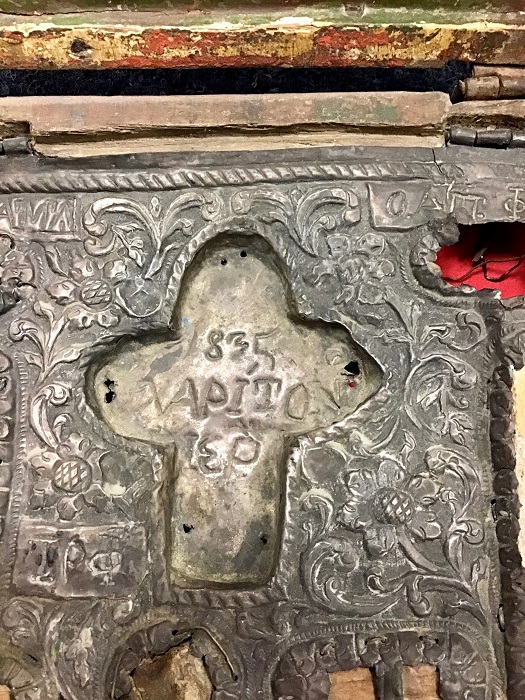 Ἡ ἐσωτερικὴ ἐπιφάνεια τοῦ καλύμματος τῆς λειψανοθήκης εἶναι ζωγραφισμένη μὲ τὶς μορφὲς ἁγίων, τῶν ὁποίων λείψανα περιέχονται σ᾽ αὐτή: Στὸ κέντρο ὁ ἅγιος Μάμας πάνω σὲ λέοντα· ἀριστερά πάνω ἱεράρχης, ποὺ δὲν σώθηκε τὸ ὄνομά του, προφανέστατα ὁ ἅγιος Μιχαὴλ Συννάδων· ἀριστερὰ κάτω ὁ ἅγιος Παντελεήμων. Δεξιὰ πάνω ὁ ἅγιος Χαράλαμπος, κάτω ὁ ἅγιος Τρύφων.
