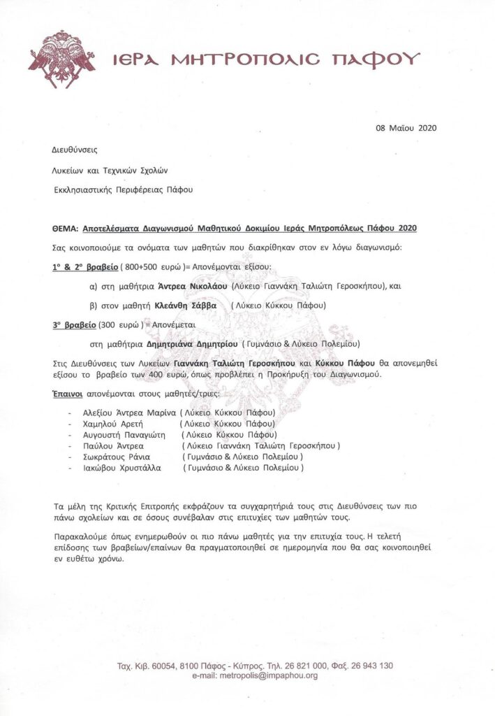 Βράβευση μαθητών στον διαγωνισμό της Μητρόπολης Πάφου