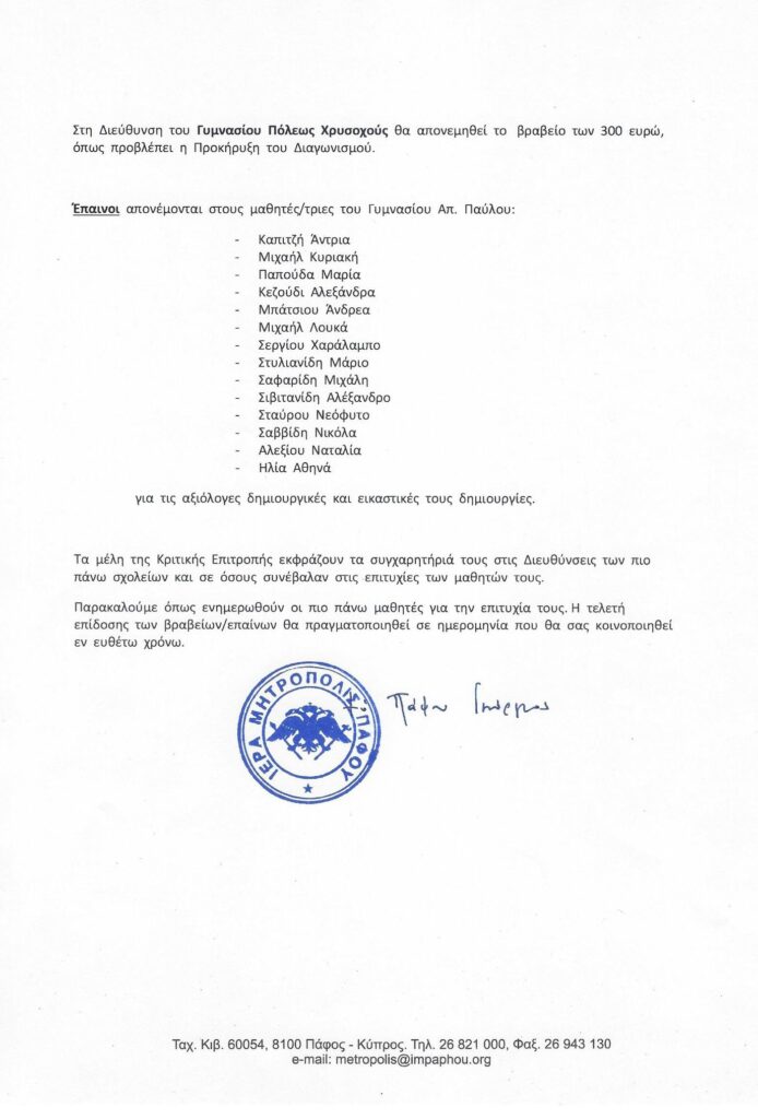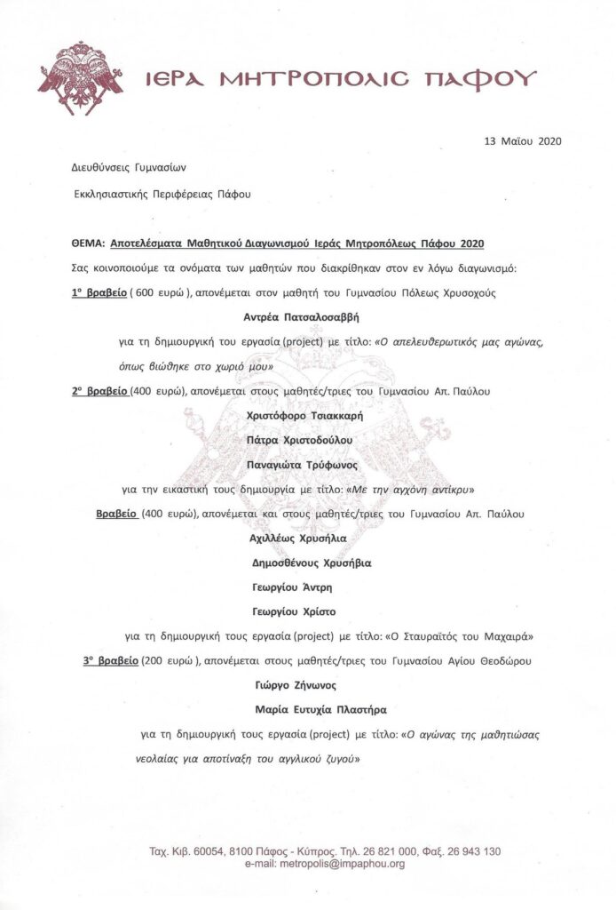 Σύμφωνα με τον Πανιερώτατο Μητροπολίτη Πάφου κ. Γεώργιο, το πρώτο βραβείο των 600 ευρώ εξασφάλισε ο μαθητής του Γυμνασίου Πόλεως Χρυσοχους Αντρέας Πατσαλοσαββή για τη δημιουργική του εργασία με θέμα τον αγώνα της ΕΟΚΑ και τη συνεισφορά της κοινότητας του .
