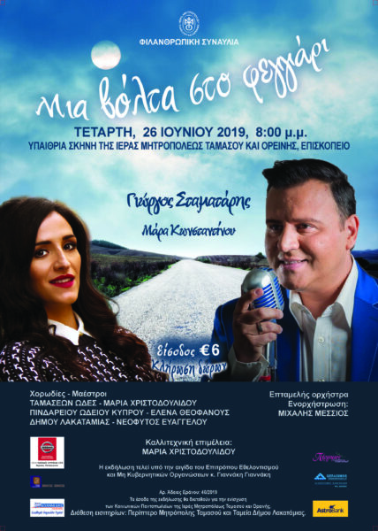 Όλα τα έσοδα της Εκδήλωσης θα διατεθούν για τις ανάγκες των Κοινωνικών Παντοπωλείων της Ιεράς Μητροπόλεως Ταμασού και Ορεινής.