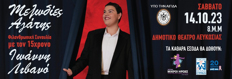 Φιλανθρωπική συναυλία υπό τον τίτλο «ΜΕΛΩΔΙΕΣ ΑΓΑΠΗΣ» θα πραγματοποιηθεί το Σάββατο 14 Οκτωβρίου 2023 και ώρα 8 μ.μ στο Δημοτικό Θέατρο Λευκωσίας.