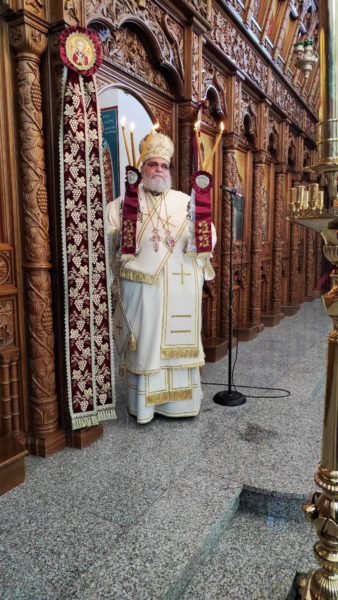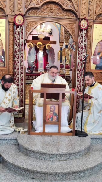 Τον Πανιερώτατο πλαισίωσαν ο Προϊστάμενος του Ιερού Ναού, Πρωτοπρεσβύτερος Θεόφιλος Αλχούρη και ο Αρχιδιάκονος π. Ραφαήλ Μισιαούλης.