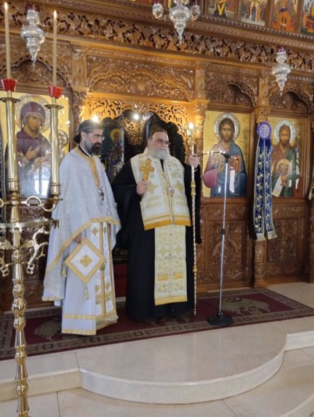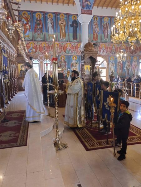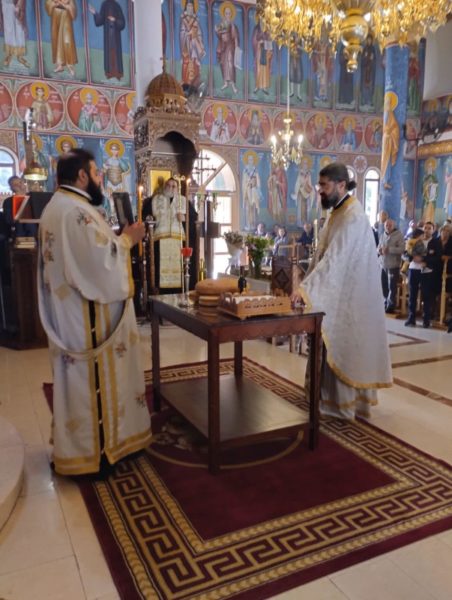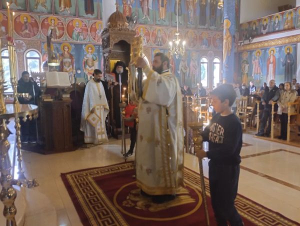 Τη Θεία Λειτουργία τέλεσε ο εφημέριος του Ναού, Πρωτοπρεσβύτερος Παναγιώτης Καϊμακλιώτης πλαισιούμενος από τον Αρχιδιάκονο Ραφαήλ Μισιαούλη.