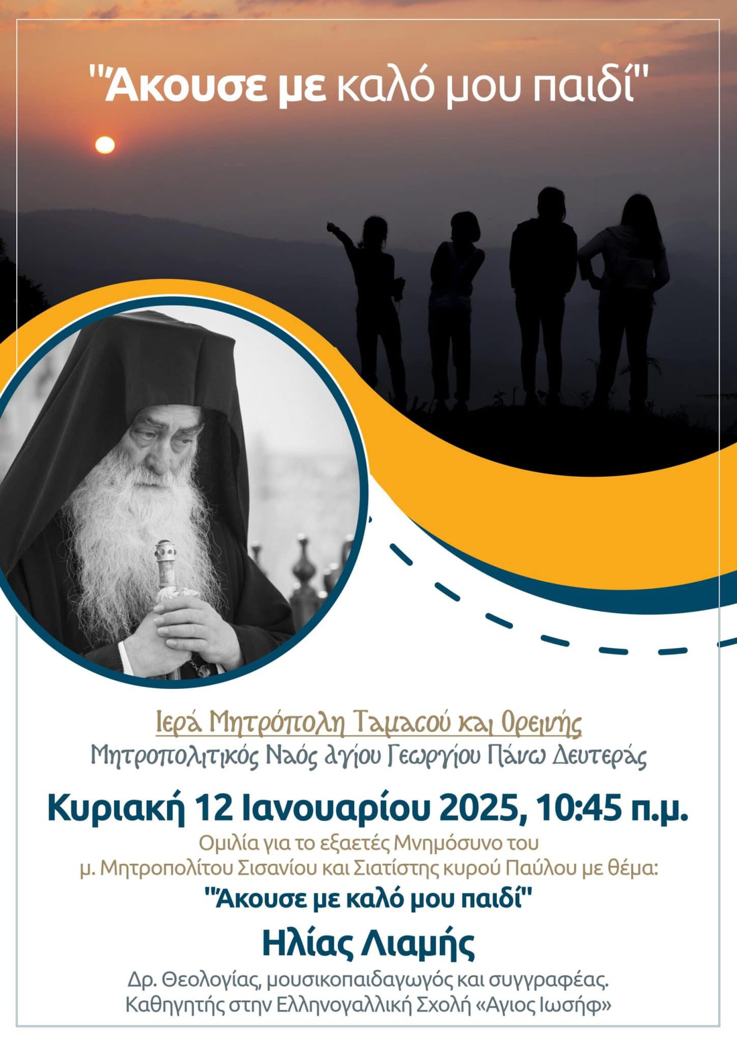 Μετά τη Θεία Λειτουργία, θα προσφερθεί πρόγευμα στην αίθουσα της Εκκλησίας και στη συνέχεια στις 10.45 π.μ., εντός της Εκκλησίας του Αγίου Γεωργίου, θα πραγματοποιηθεί Εκδήλωση – Αφιέρωμα στον μακαριστό Μητροπολίτη με ομιλητή τον εξ Ελλάδος Ελλογιμώτατο κ. Ηλία Λιαμή, Δρ. Θεολογίας, Μουσικοπαιδαγωγό και συγγραφέα, καθηγητή στην Ελληνογαλλική Σχολή «Αγιος Ιωσήφ», ο οποίος θα μιλήσει με θέμα: “Άκουσε με καλό μου παιδί”.