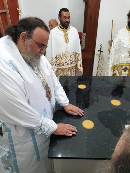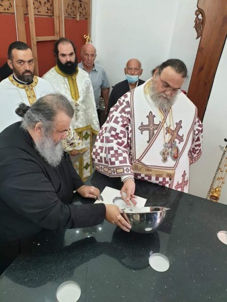Ο Πανιερώτατος λιτάνευσε τα ιερά λείψανα τρεις φορές γύρω από το Παρεκκλήσιο, και στη συνέχεια ακολούθησε το τελετουργικό της εισόδου σε αυτόν, τον καθαγιασμό της Αγίας Τραπέζης με τα στάδια που έχει της τοποθέτησης των ιερών λειψάνων του Αγίου Μεγαλομάρτυρος Γεωργίου του Τροπαιοφόρου και των Μεγαλομαρτύρων γυναικών Μαρίνης και Ειρήνης στο “φυτό” της Αγίας Τραπέζης, της σφράγισής του με κηρομαστίχη, της έκπλυσης της Αγίας Τραπέζης με ζεστό νερό, σαπούνια και σφουγγάρια και το σκούπισμά της, το μύρωμα με Άγιο Μύρο, η ένδυσης με το κατασάρκιο επάνω στο οποίο ενεγράφη η ημερομηνία των εγκαινίων και υπογράφηκε από τον Πανιερώτατο, και με τα λευκά άμφια των εγκαινίων, το άναμμα της κανδήλας της Αγίας Τραπέζης και τον καθαγιασμό του Παρεκκλησίου.