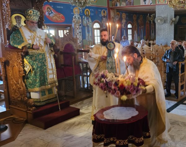 Τον Πανιερώτατο πλαισίωναν ο Προϊστάμενος του Ναού, Πρωτοπρεσβύτερος Παρασκευάς Αγάθωνος και ο Αρχιδιάκονος π. Ραφαήλ Μισιαούλης.