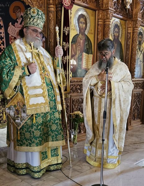 Τον Πανιερώτατο πλαισίωναν ο Προϊστάμενος του Ναού, Πρωτοπρεσβύτερος Παρασκευάς Αγάθωνος και ο Αρχιδιάκονος π. Ραφαήλ Μισιαούλης.