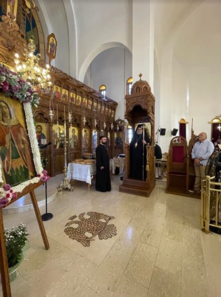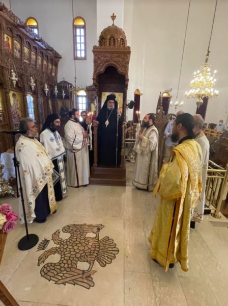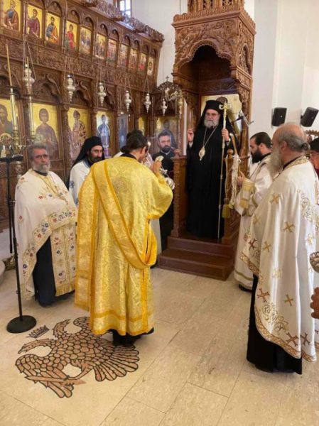 Τον Πανιερώτατο πλαισίωναν ο Πανοσιολογιώτατος Αρχιμανδρίτης Ηρακλείδιος Κλεάνθους, οι Πρωτοπρεσβύτεροι Αδάμος Αδάμου και Δήμος Δημοσθένους, εφημέριος του πανηγυρίζοντος Ναού, ο Αρχιδιάκονος Ραφαήλ Μισιαούλης και οι Ιεροδιάκονοι Μακάριος και Αρσένιος.