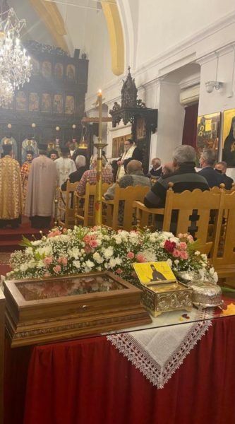 Συνεχάρη τον Πρωτοσυγκελλεύοντα της Μητροπόλεως, Πρωτοπρεσβύτερο Θεόδωρο Στυλιανού, Προϊστάμενο της ενορίας μετά των λοιπών ιερέων και της εκκλησιαστικής επιτροπής για την πρωτοβουλία και διοργάνωση του προσκυνήματος των ιερών λειψάνων του Αγίου Εφραίμ.