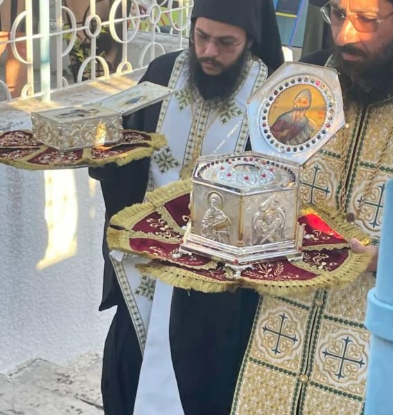 Τα ιερά θησαυρίσματα προσκόμισαν οι Πατέρες του Ιερού Μητροπολιτικού Ησυχαστηρίου Οσίου Αββακούμ του εν Καλαμιθάση, Αρχιμανδρίτες Νεκτάριος Γεωργίου και Πορφύριος Ττόουλος, και τα υποδέχθηκε ο Πανιερώτατος Μητροπολίτης Ταμασού και Ορεινής κ. Ησαΐας συμπαραστατούμενος από κληρικούς της Μητροπόλεως, την Πέμπτη το εσπέρας, 21 Ιουλίου 2022.