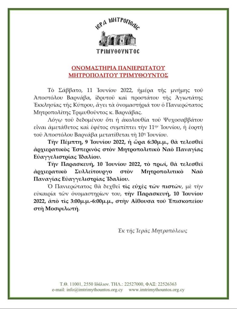 Το Σάββατο 11 Ιουνίου ημέρα μνήμης του Αποστόλου Βαρβάβα, ιδρυτή και προστάτη της Εκκλησίας Κύπρου, άγει τα ονομαστήριά του ο Πανιερώτατος Μητροπολίτης Τριμυθούντος κ. Βαρνάβας.