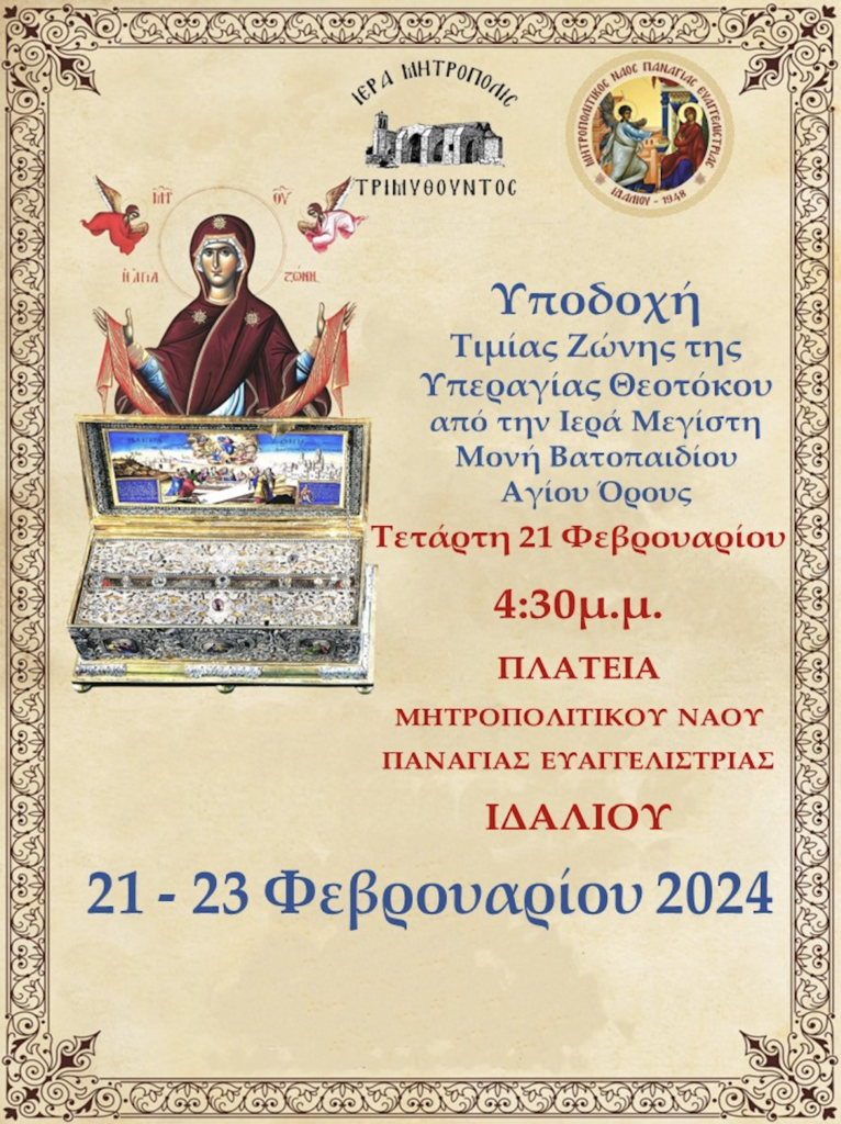 Την Αγία Ζώνη θα υποδεχτεί η Ιερά Μητρόπολη Τριμυθούντος την Τετάρτη 21 Φεβρουαρίου στις 16:30, όπου και θα παραμείνει προς προσκύνηση και ευλογία του πιστού λαού στον Ιερό Μητροπολιτικό Ναό Παναγίας Ευαγγελιστρίας Ιδαλίου, έως και την Παρασκευή 23 Φεβρουαρίου.